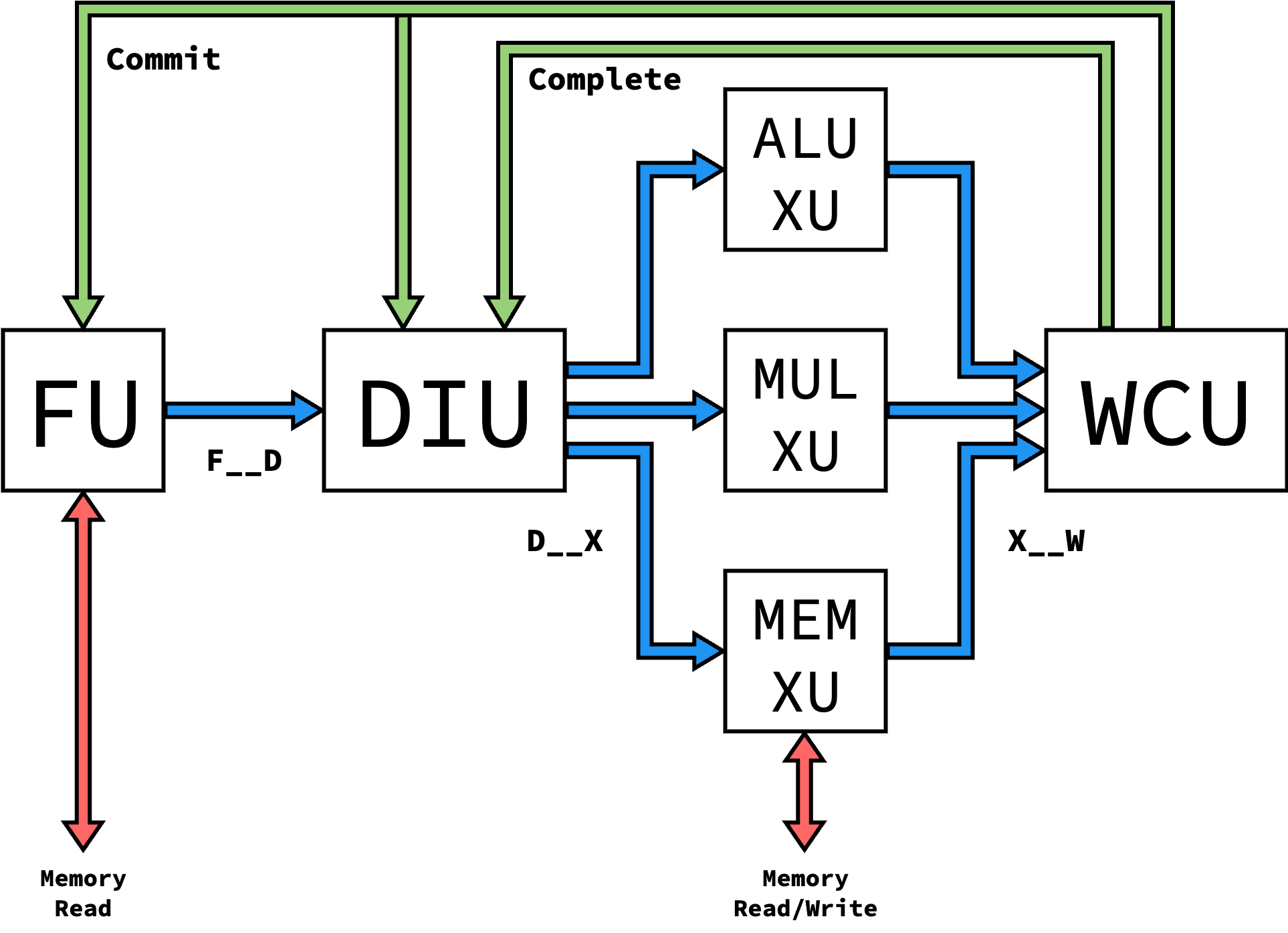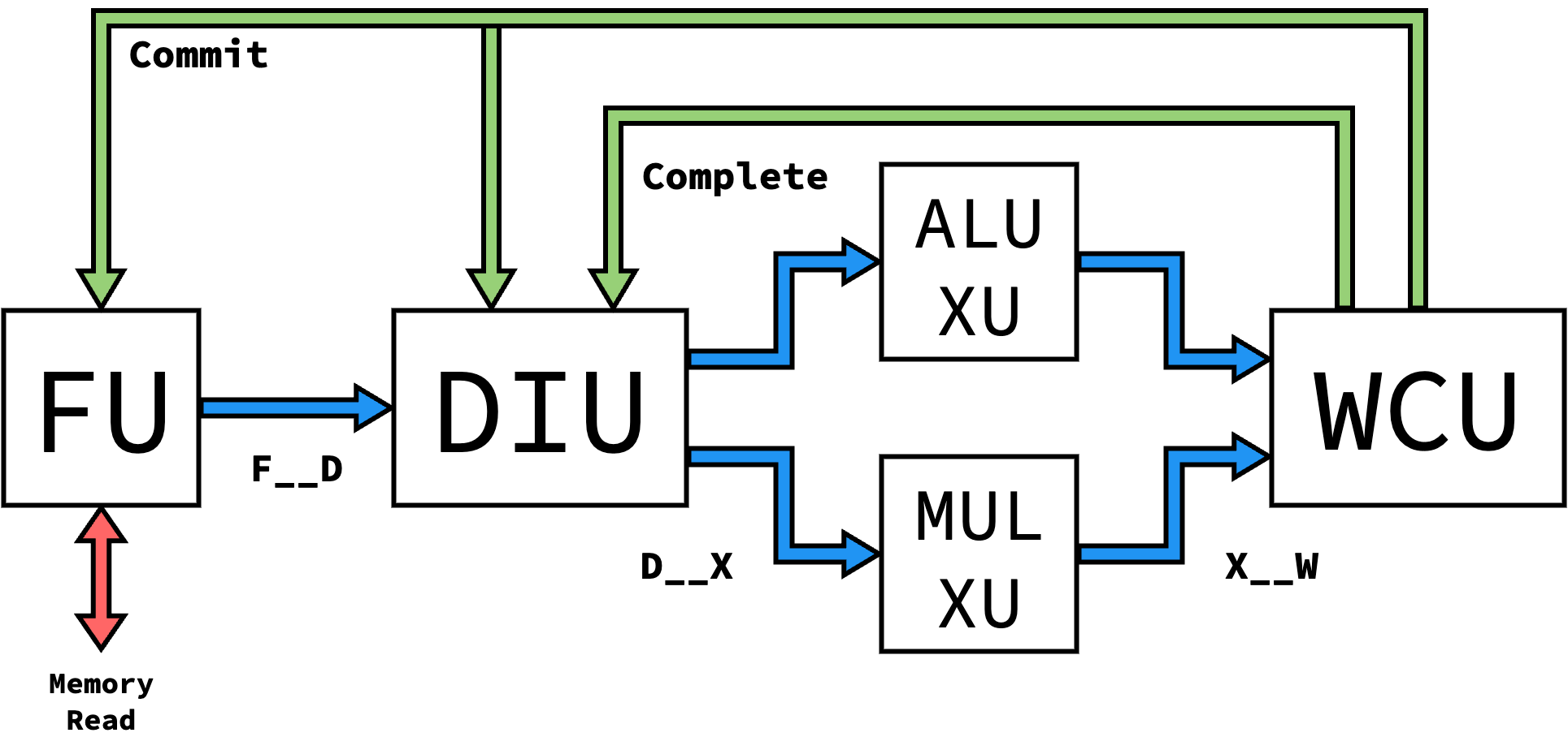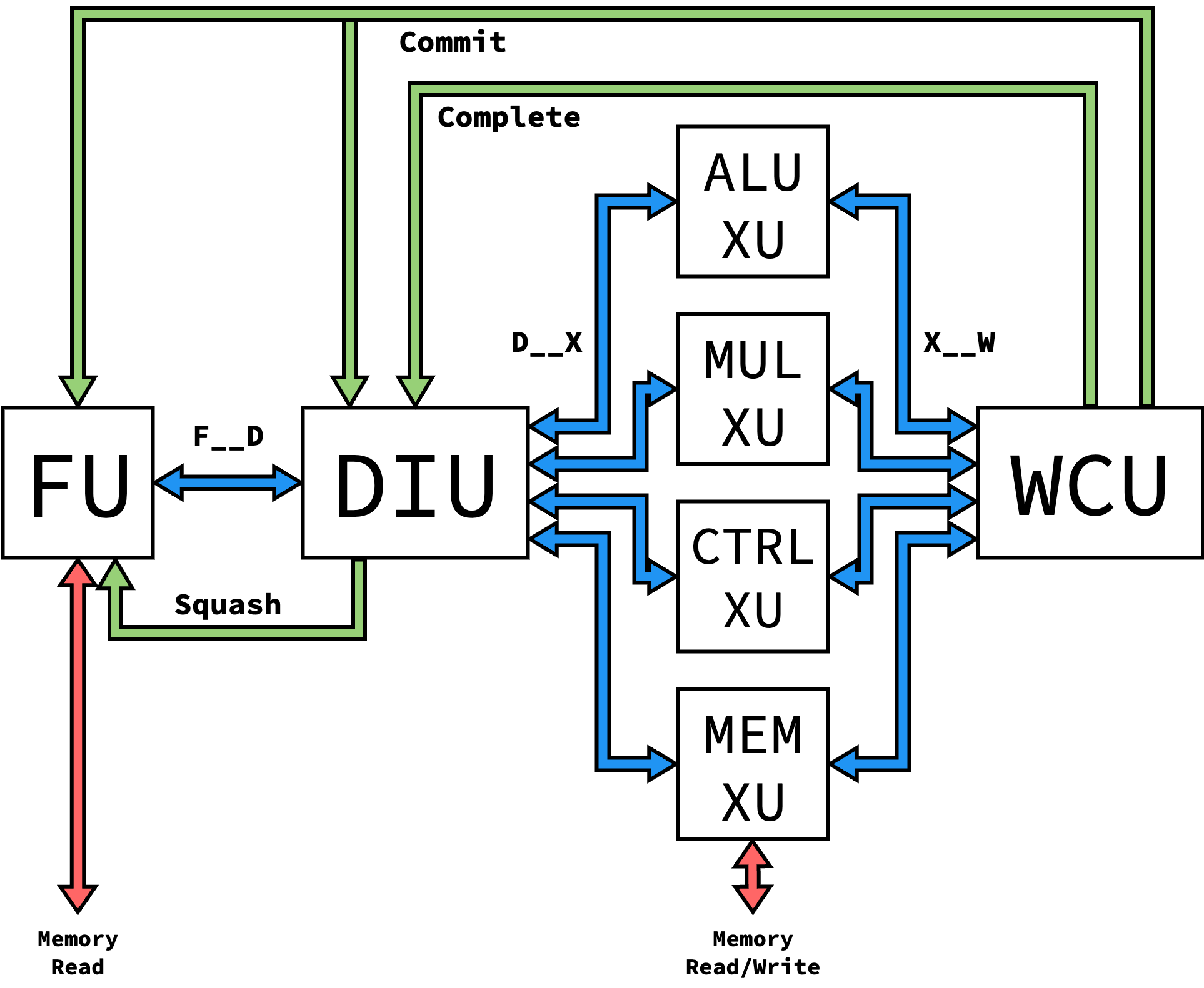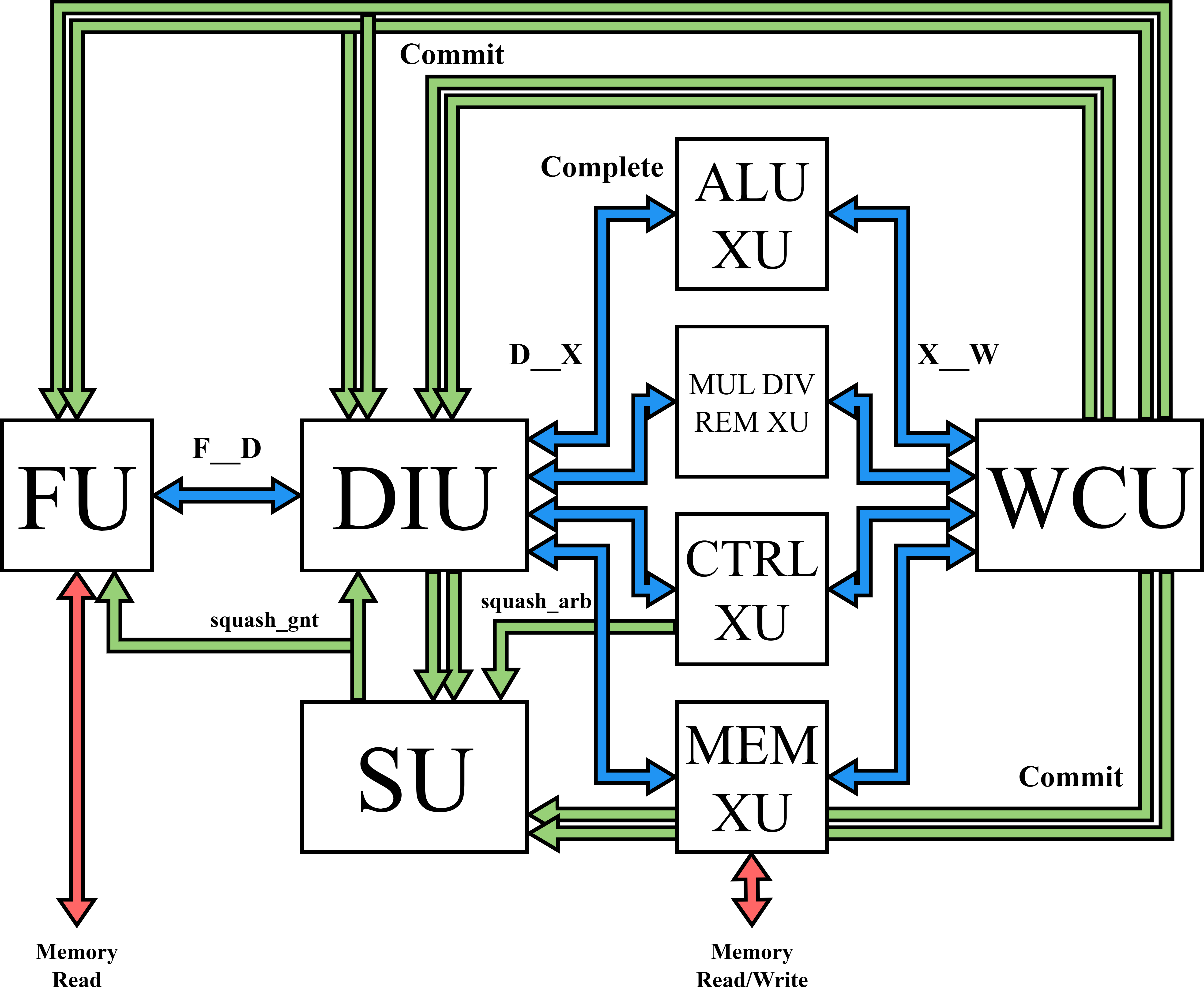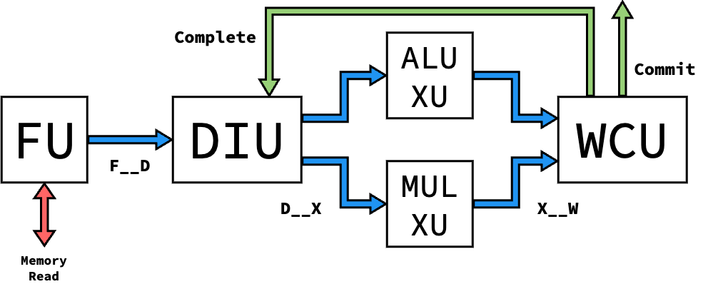 Currently, our processor requires that the control flow XU acts on control flow instructions in one cycle. This simplifies the design by not allowing mistakenly-speculated instructions to get past the DIU, but isn’t as modular as possible in design. An ideal implementation (discussed in Further Work) wouldn’t impose this limitation, but would additionally require all other XUs and the WCU to listen to and act on a squash interface.