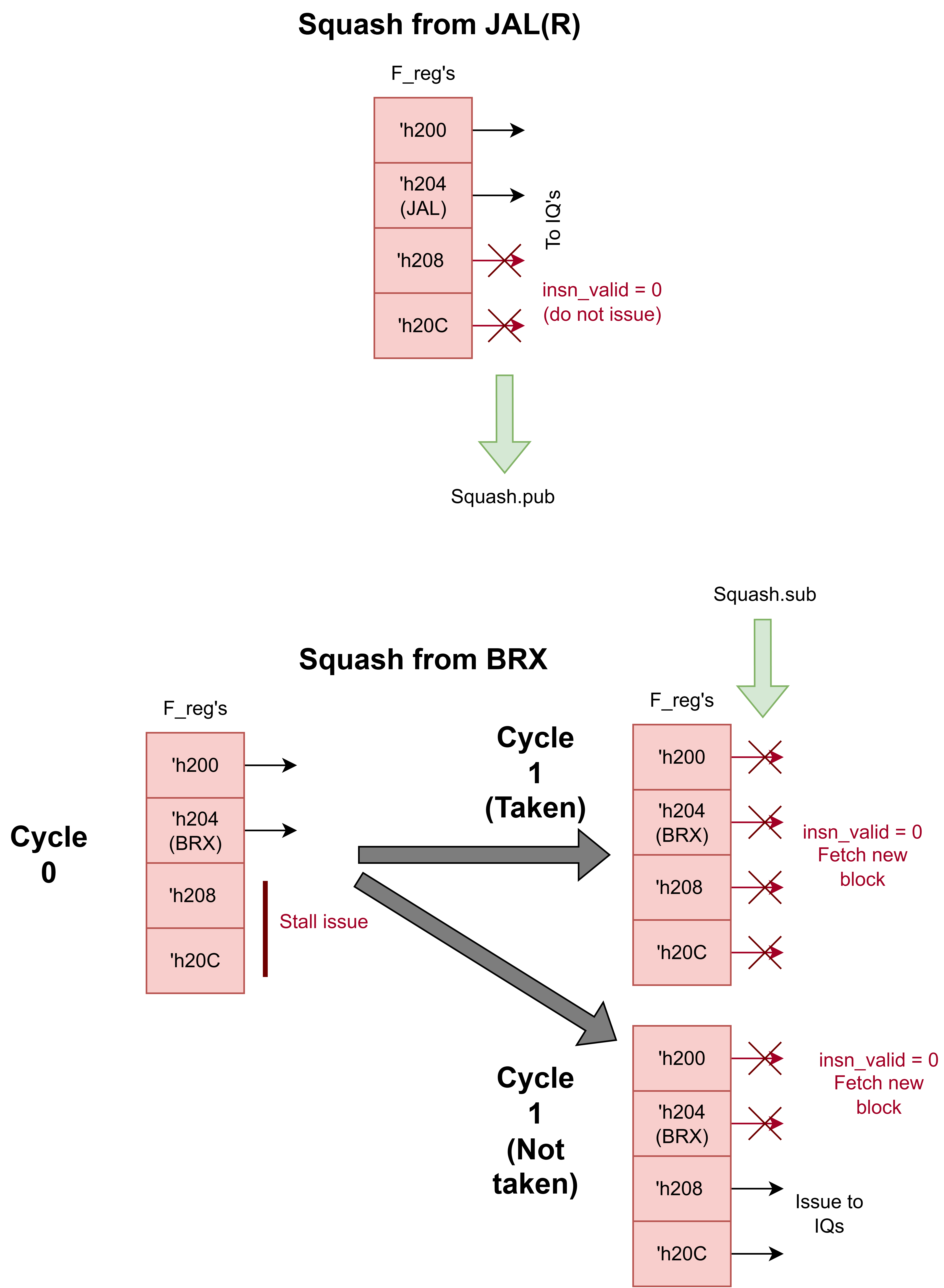 SSSeqAge. For BRX instructions, younger instructions in the window are blocked from dispatching until the branch’s source operands are ready and it can be dispatched. For JAL/JALR instructions, the oldest control instruction must be able to dispatch (pass S4) before younger instructions proceed. Instructions younger than the oldest control instruction are also blocked when a squash is pending onsquash_sub.S3 — Physical register allocation: Checks that a free physical register is available for allocation (via